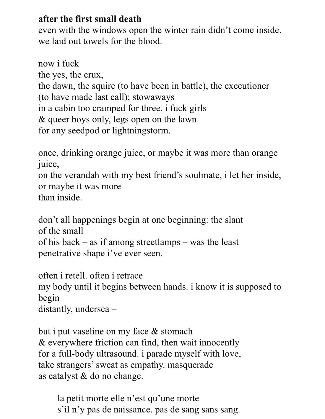 Sophie Crocker is a queer white settler based on Coast Salish land and her pronouns are she/her. Her previous publications include The Fiddlehead, Room, and Plenitude, and she has fiction forthcoming in Nashville Review. She is on Twitter and Instagram under the handle @goblinpuck.