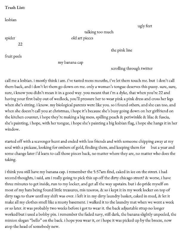 Sofia Fey is a Queer and Non-Binary writer living in North Hollywood, California. Primarily they are a theatre maker, filmmaker, and a writer of poetry and graphic novels. But to pay the bills, they can be found pouring a latte or a nice shot of espresso. They have just written and produced a short film that is called Midwestern and it is in post-production. Most recently their work has appeared in Sobotka Magazine and The Collective Magazine. Currently, they are the founding editor at Cabaret Contributorās Journal. They are hoping to eventually write for TV and publish a chapbook of their poetry.