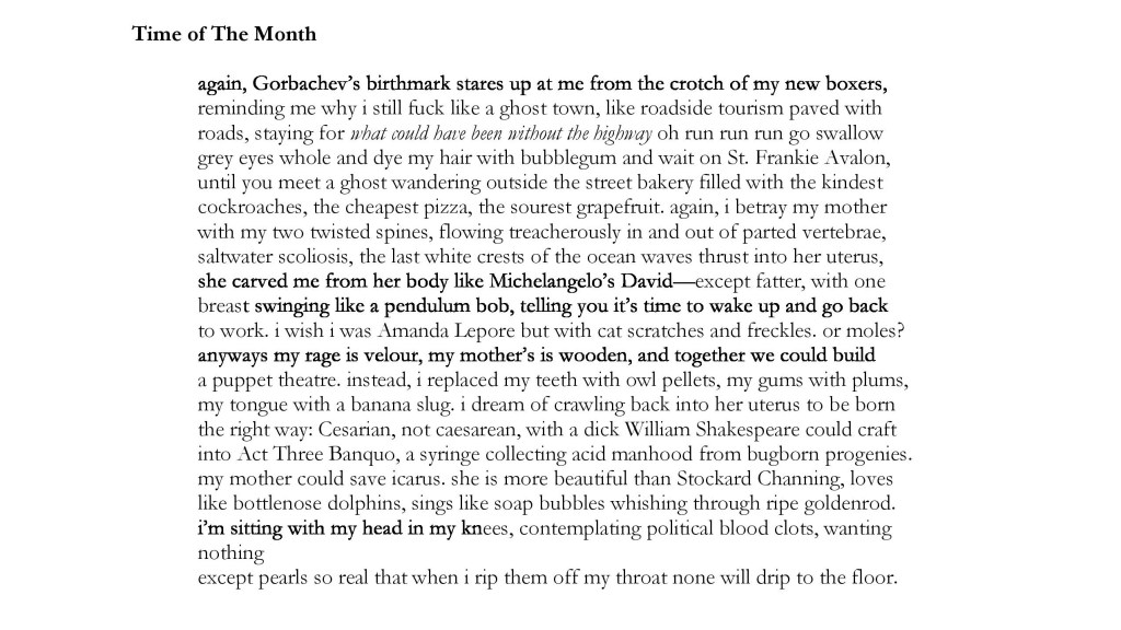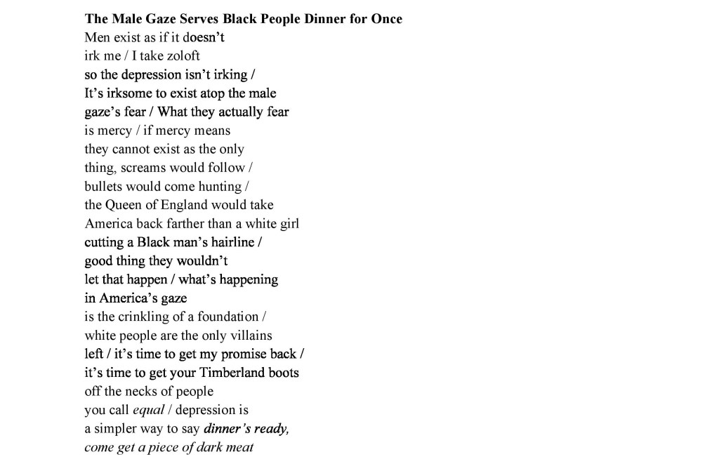 Originally from the Midwest, Janine Blue’s prose and hybrid work intertwine feminism, queer culture, and critical race theory. Likewise, her work highlights matters such as police brutality and mental health. As a queer Black female, her intersectional identity is embedded into her writing regardless of the medium or subject matter.