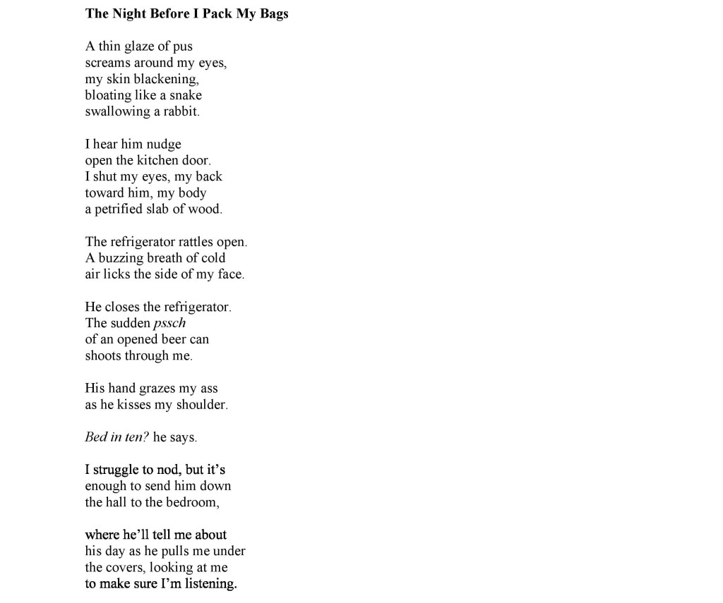 Nadine Klassen (she/her) is a German poet, living in her hometown. Her work focuses on mental health, trauma, relationships and identity. It has been published by Gnashing Teeth Publishing, Anti-Heroin Chic, Olney and others. She likes to write the occasional song, crochet sweaters with puffy sleeves or paint.Instagram: nadineklassen.writer